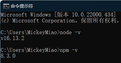 win+R输入cmd, 打开命令行, 输入node -v 返回版本号即安装成功, 输入npm -v 返回版本号即安装成功