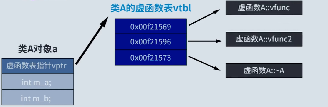 vptr = &A::vtable; // 为vptr赋值, 使得vptr指向类A的虚函数表vtbl