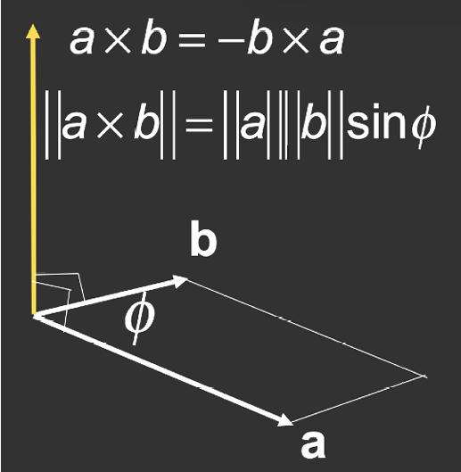\[\vec{a} \times \vec{b} = -\vec{b} \times \vec{a}\] \[||\vec{a} \times \vec{b}|| = ||\vec{a}|| \cdot ||\vec{b}|| \cdot \sin(\theta)\]- 法向量: 向量叉乘得到的向量与两个初始向量都垂直(垂直于两个向量所在的平面)