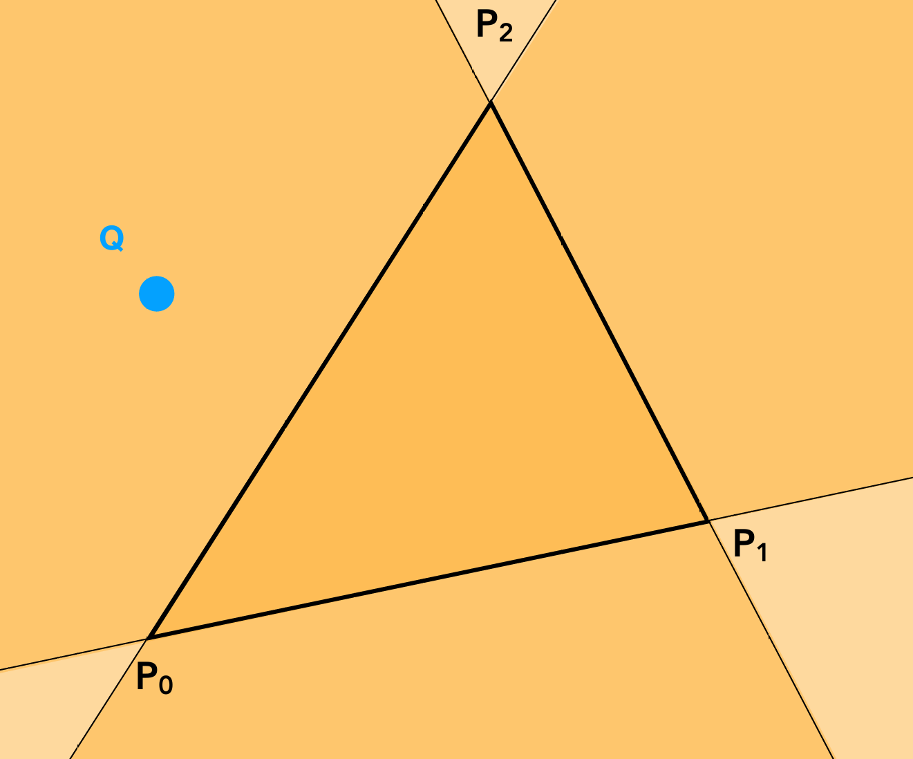 \[P_0P_1 \times P_0Q \geq 0: Q 在 P_0P_1 的左侧\] \[P_1P_2 \times P_1Q \geq 0: Q 在 P_1P_2 的左侧\] \[P_2P_0 \times P_2Q \leq 0: Q 在 P_2P_0 的右侧\]综上, 当在同一侧时, 叉乘的结果应该同号, 所以 $Q$ 在三角形外部