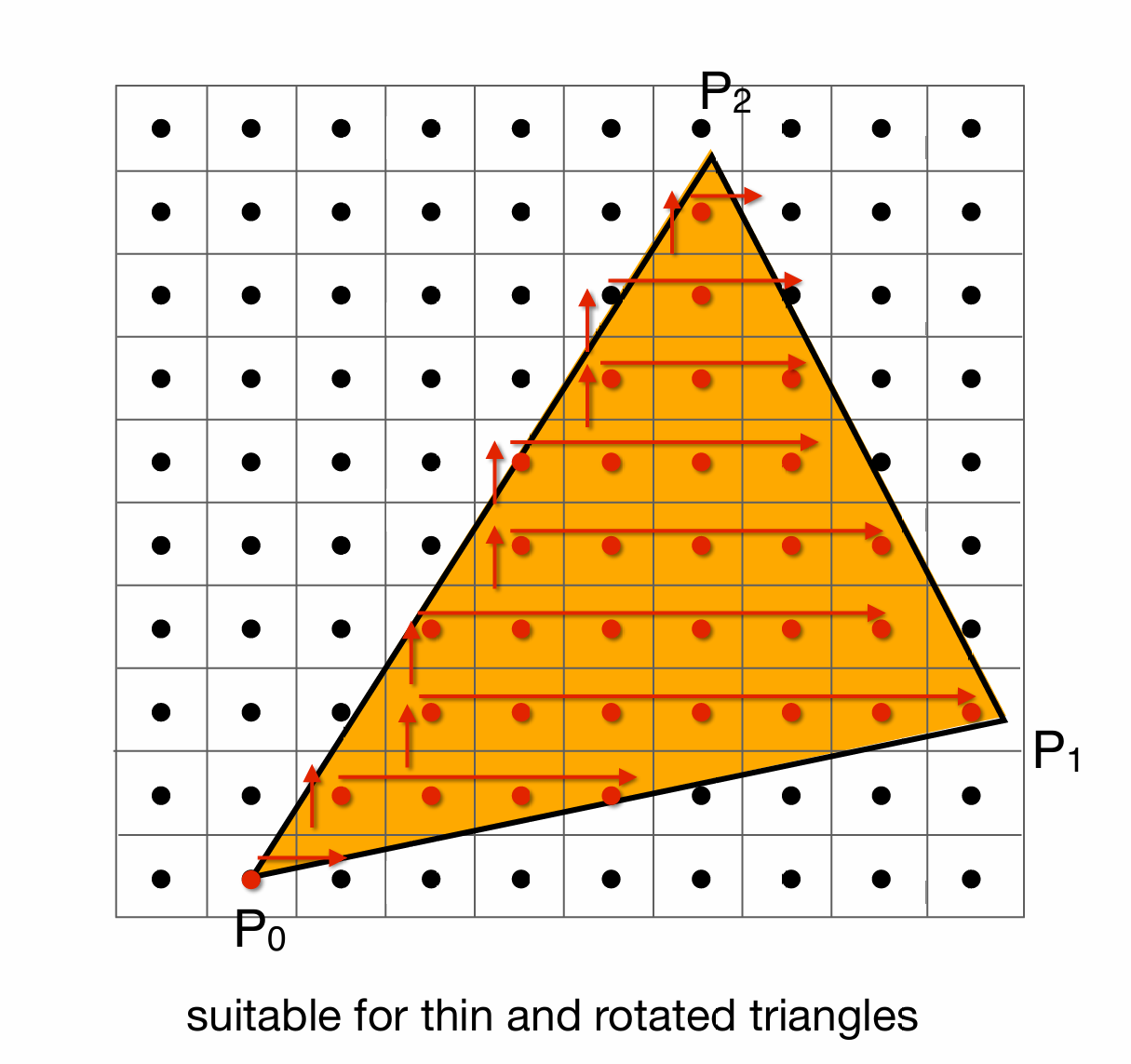 对于上图中的三角形, 我们可以对其每一行像素都计算其最左最右, 从而减少像素的计算量
