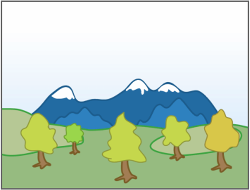 例如下图中, 从后往前绘制, 会先绘制远处的山脉, 再绘制草地, 草地会覆盖部分山脉的像素, 然后绘制树木, 树木会覆盖部分草地的像素, 也会覆盖部分山脉的像素: