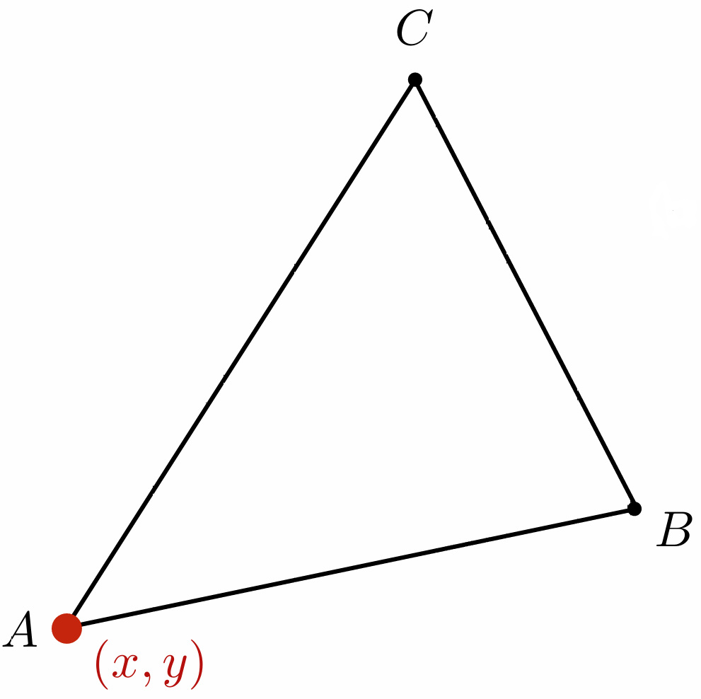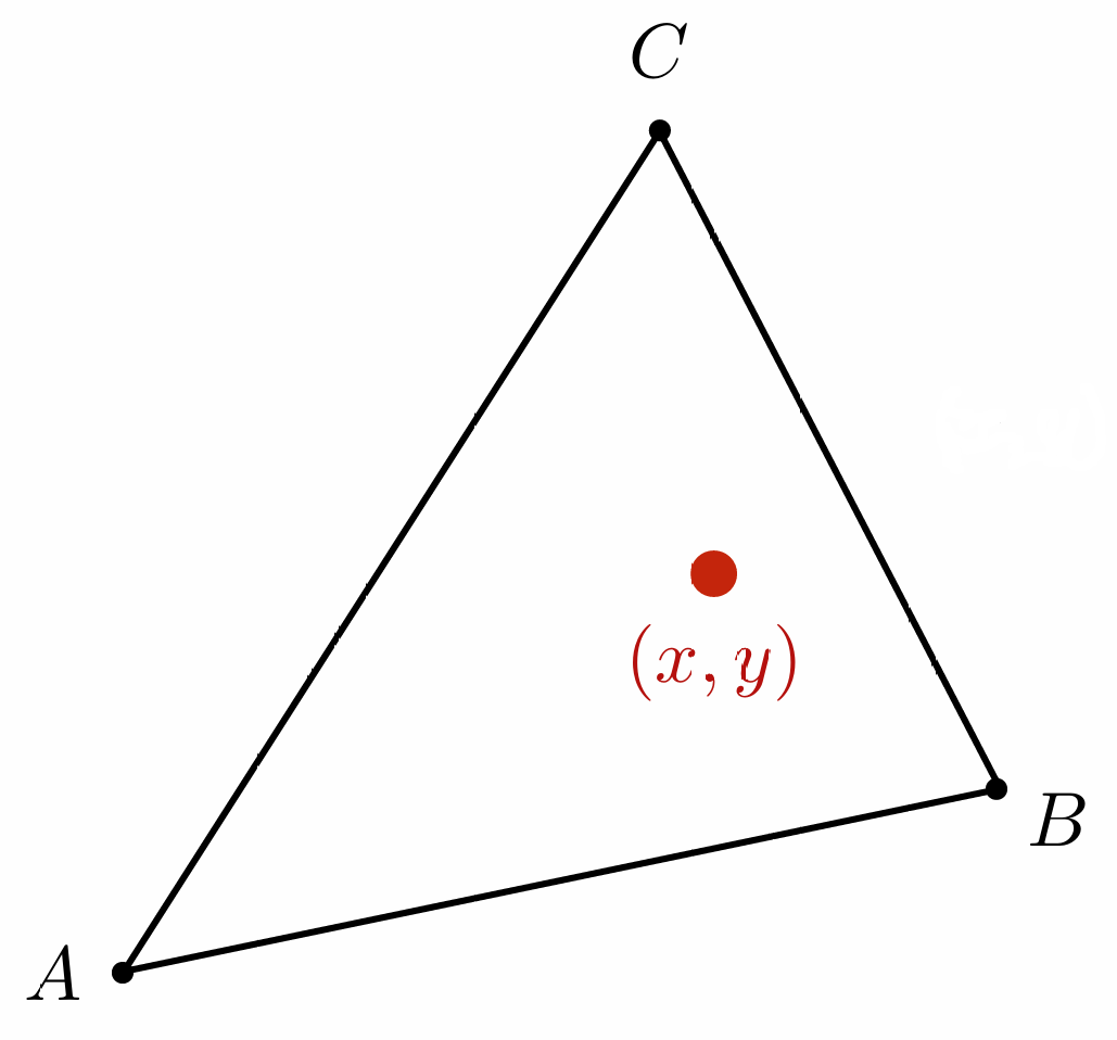 \[(x,y) = \alpha A + \beta B + \gamma C \quad \text{其中} \quad \alpha + \beta + \gamma = 1\]也就是说, 任意点 $(x,y)$ 在重心坐标系下的坐标为 $(\alpha, \beta, \gamma)$