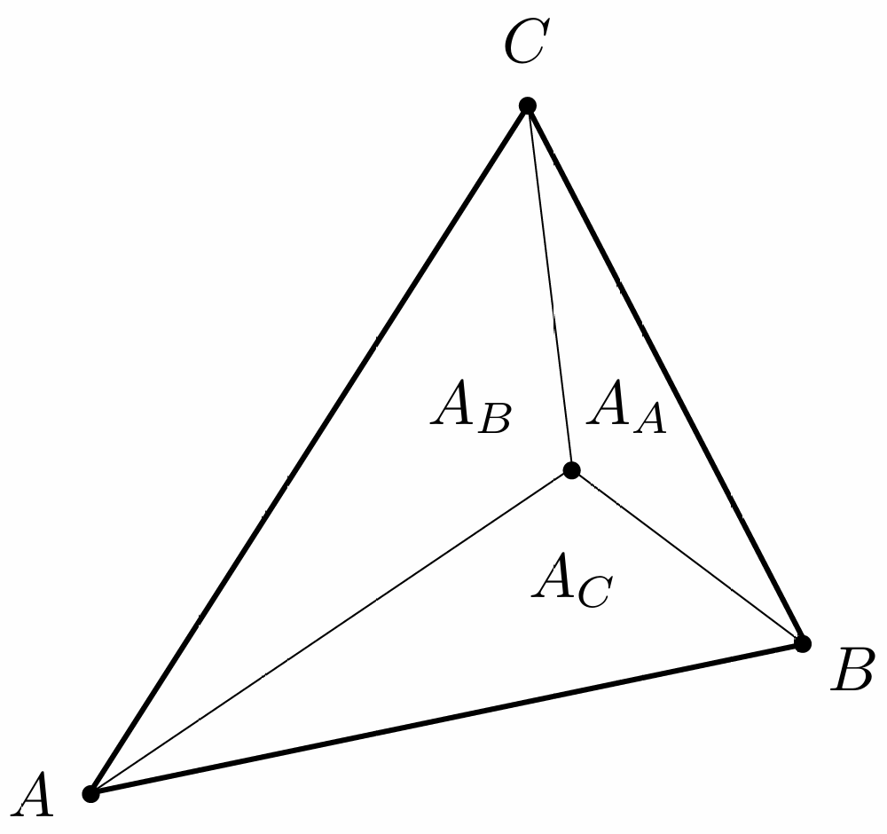 \[\alpha = \frac{A_A}{A_A+A_B+A_C}\\ \beta = \frac{A_B}{A_A+A_B+A_C}\\ \gamma = \frac{A_C}{A_A+A_B+A_C}\]重心