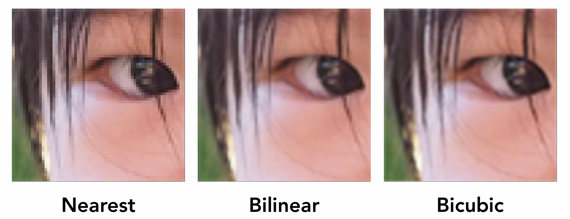 - Bilinear: 双线性插值, 通过四个最近的像素点的颜色进行插值.