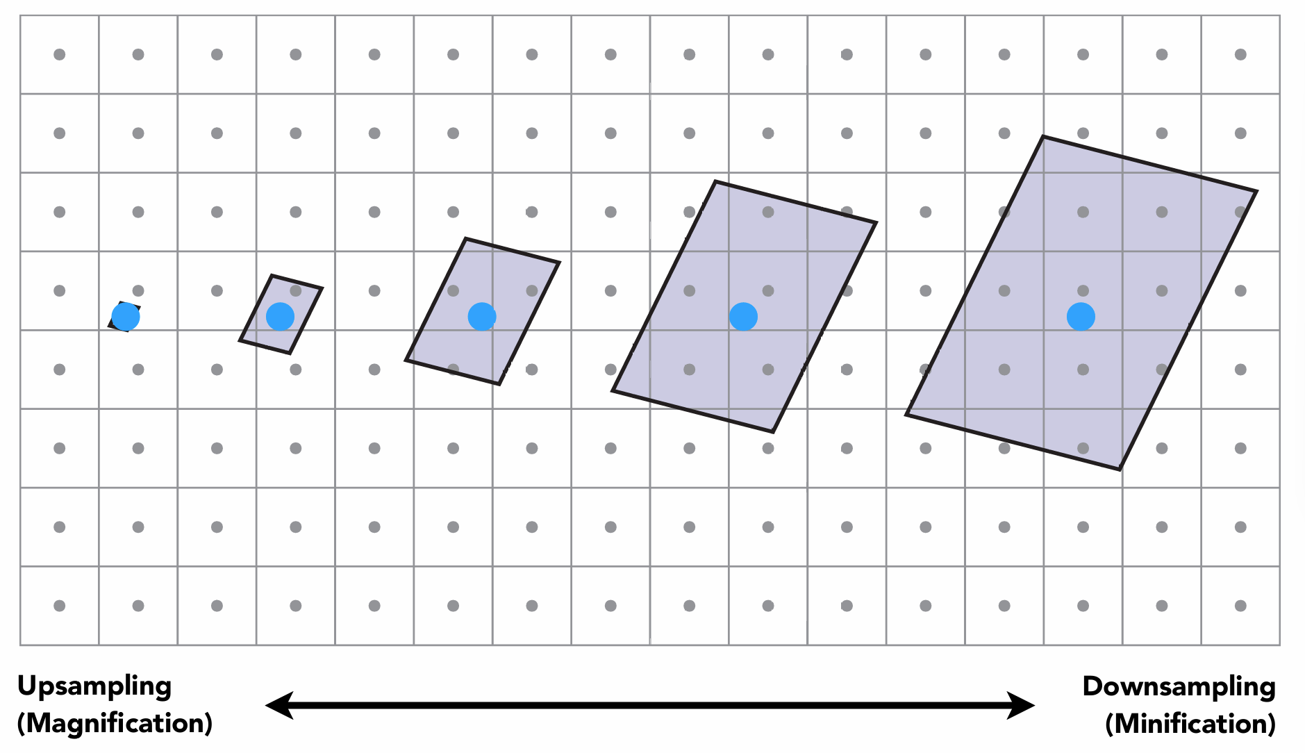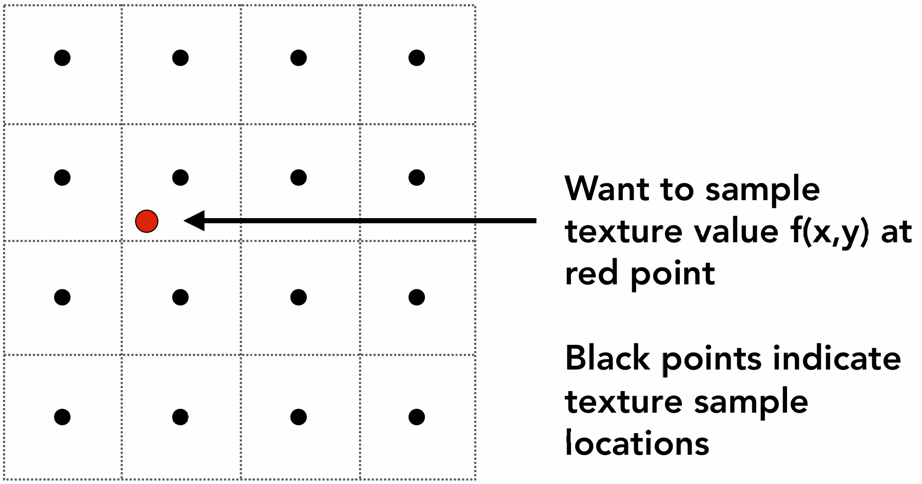 如图, 背景4×4的点是纹理图的像素, 红色的点是采样点, 采样点映射到的纹理坐标不是整数