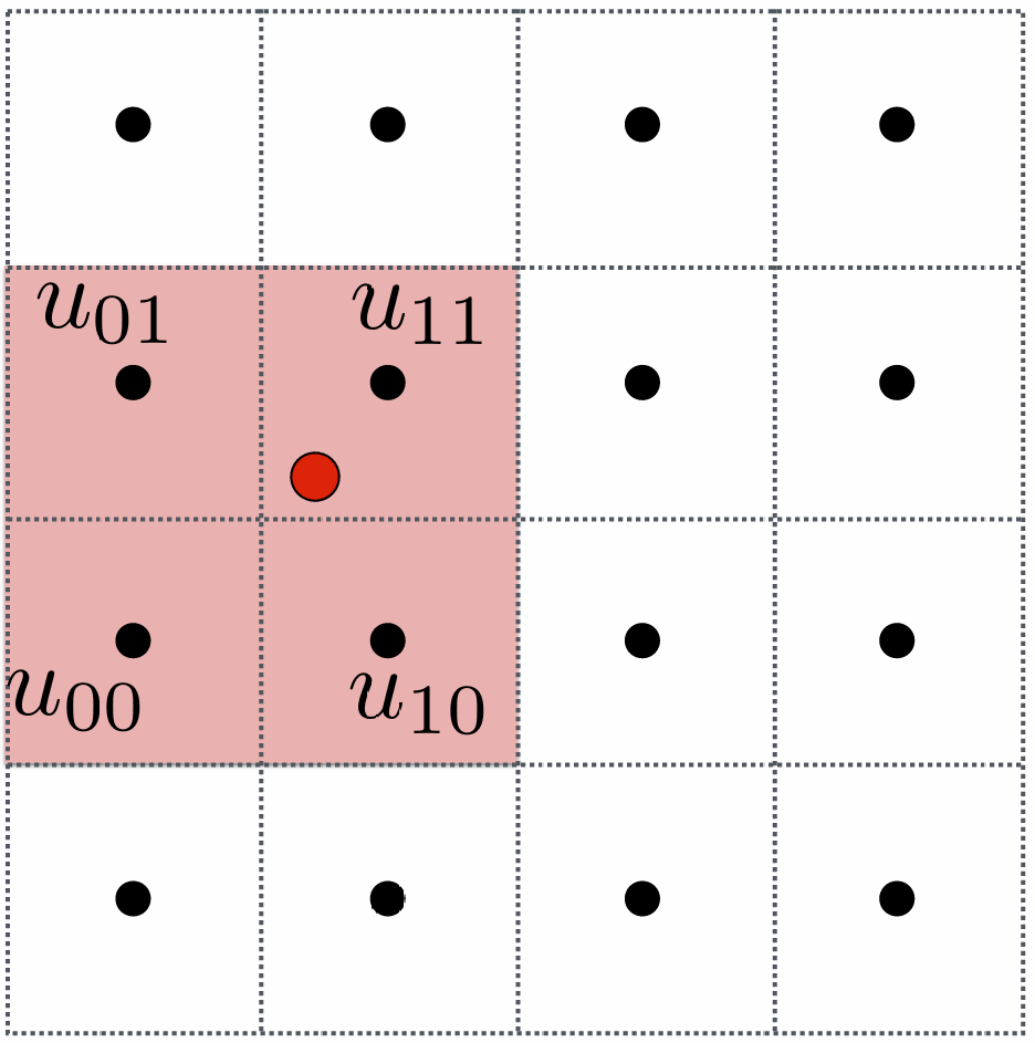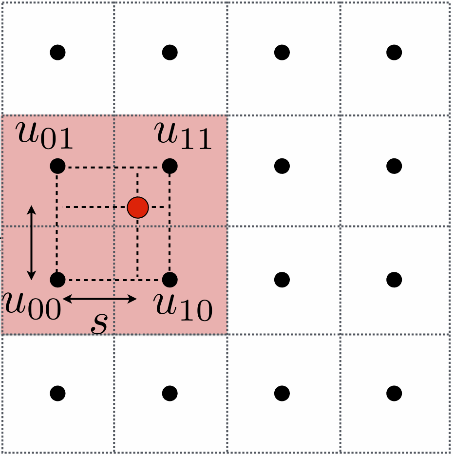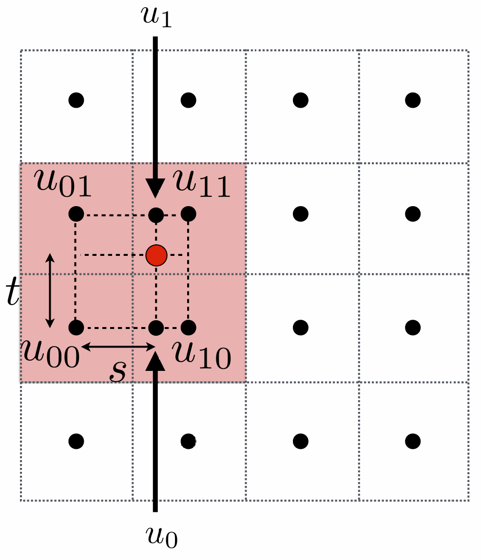 这四个点分别是 $u_00, u_01, u_10, u_11$, 采样点(红点)离左下角的 $u_00$ 的竖直和水平距离分别是 $t$ 和 $s$: