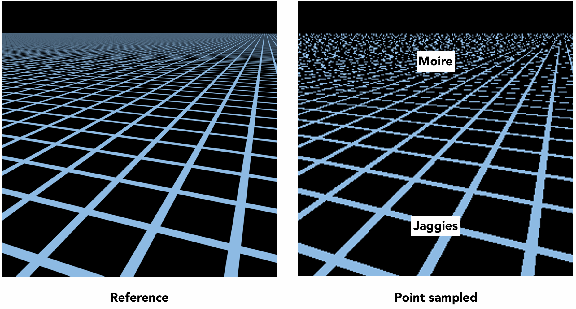 即: 远处出现摩尔纹(Moire Pattern), 近处出现锯齿(Jaggies), 见右图.