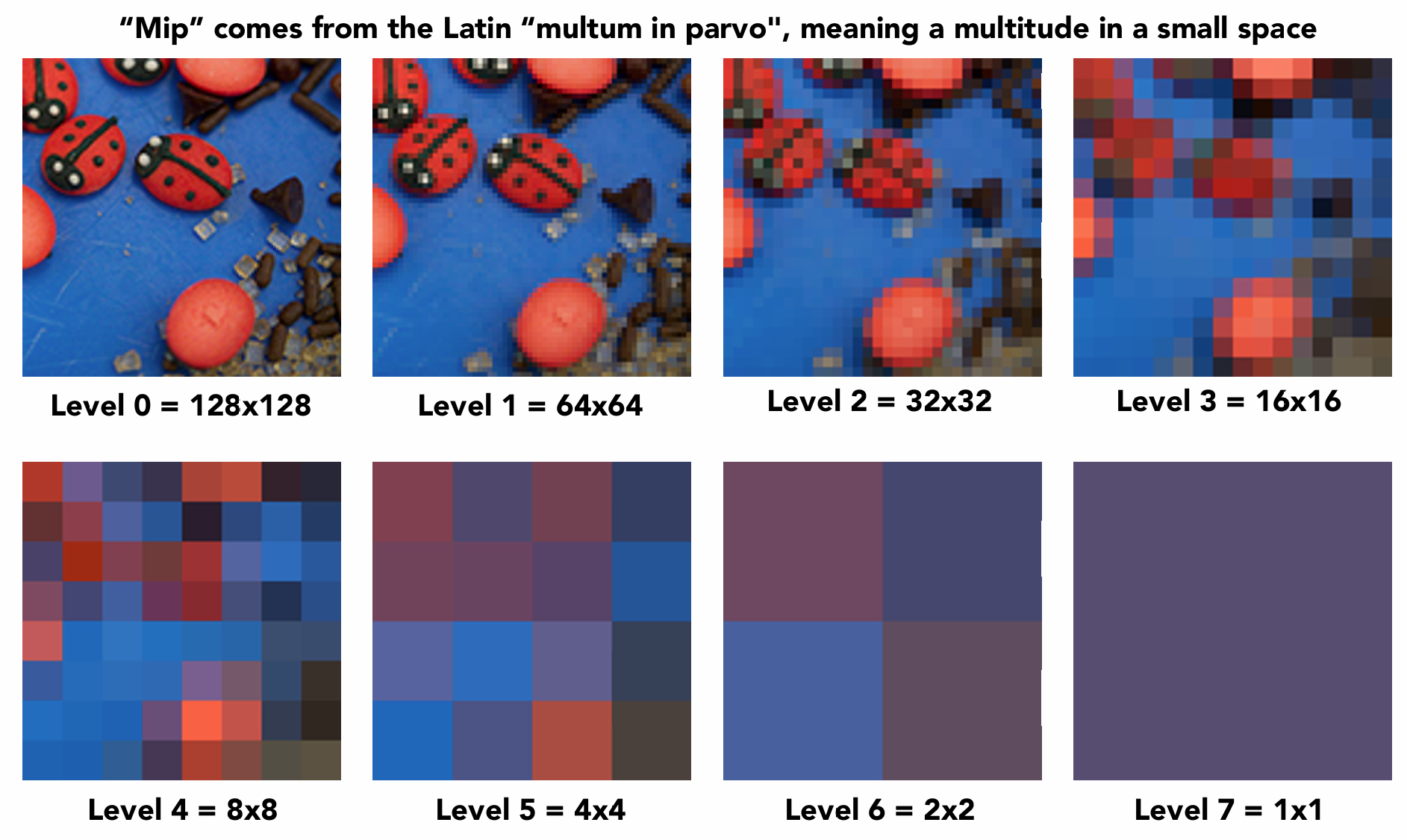每张大一层级的Mipmap纹理是由上一层级的纹理缩小得到的, 边长的像素量减少为原来的一半, 总像素量减少为原来的四分之一, 每一层级以此类推, 直到最小的一张纹理为1×1的像素.