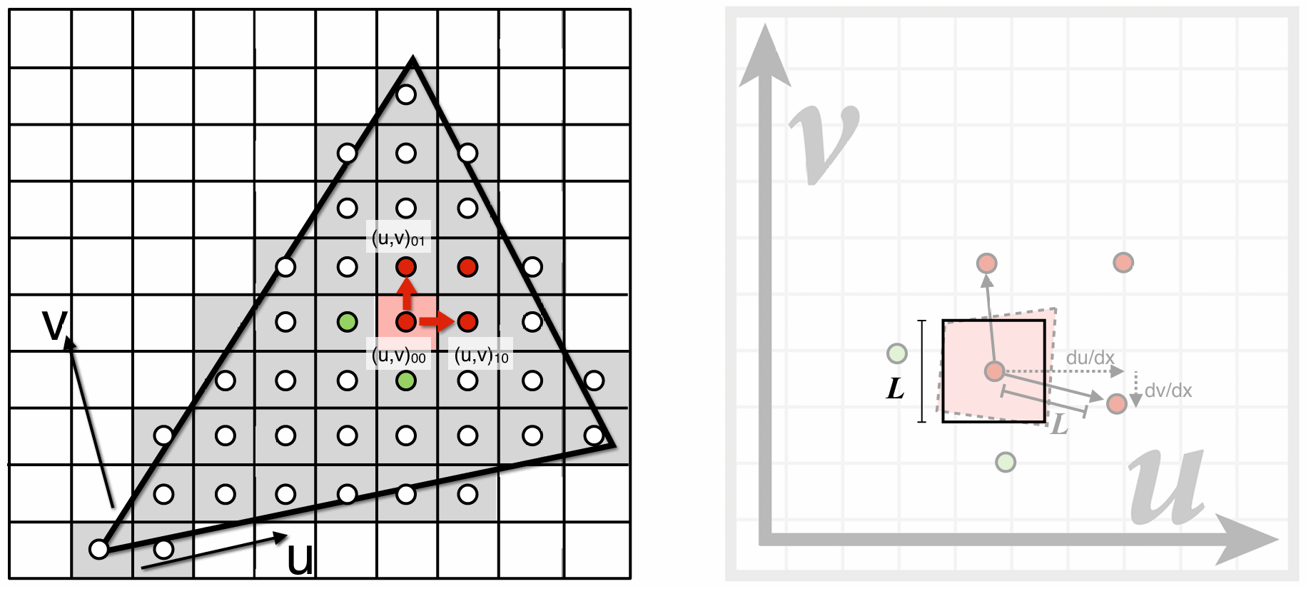 \[L = max(\sqrt{(\frac{du}{dx})^2 + (\frac{dv}{dx})^2},\sqrt{(\frac{du}{dy})^2 + (\frac{dv}{dy})^2})\]这里计算的 $L$ 将会作为一个正方形的边长, 用来计算Mipmap的Level $D$, 这个正方形将会是这一层的Mipmap纹理的像素: