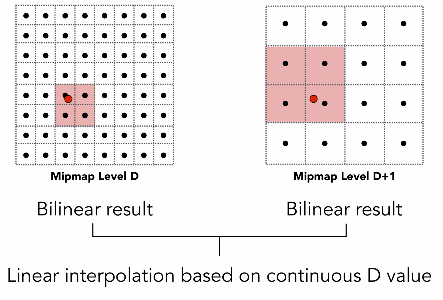 如果我们想要得到连续的结果, 可以使用两个Mipmap Level 之间的结果进行插值: