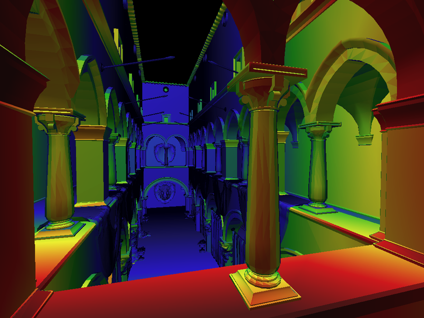 \[\alpha = \frac {-(x-x_B)(y_C-y_B) + (y-y_B)(x_C-x_B)} {-(x_A-x_B)(y_C-y_B) + (y_A-y_B)(x_C-x_B)}\\ \beta = \frac {-(x-x_C)(y_A-y_C) + (y-y_C)(x_A-x_C)} {-(x_B-x_C)(y_A-y_C) + (y_B-y_C)(x_A-x_C)}\\ \gamma = 1 - \alpha - \beta\]重心坐标插值