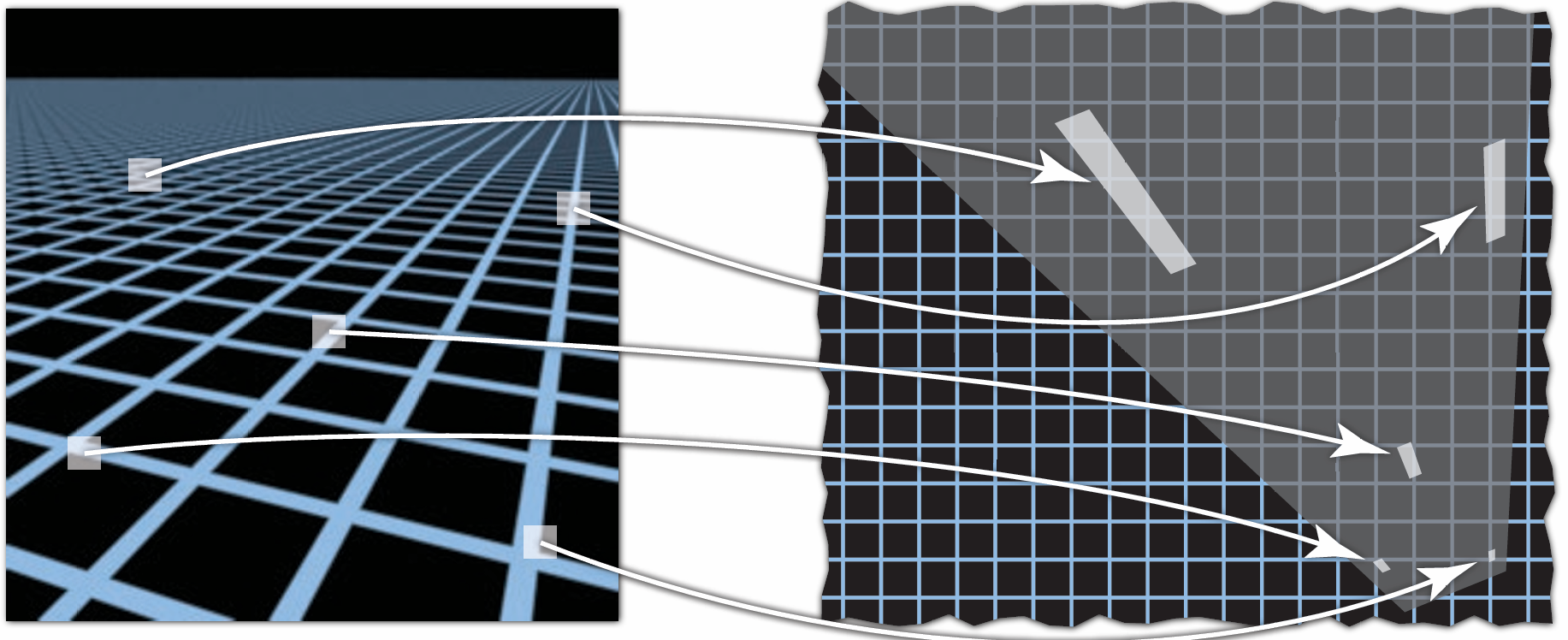 这是因为, 在观察近处的物体时, 一个像素覆盖的纹理区域较小, 该像素的采样点在纹理上采样的结果与所该像素覆盖的纹理区域所含像素一样(或接近), 得到的效果和预期值相比较为准确