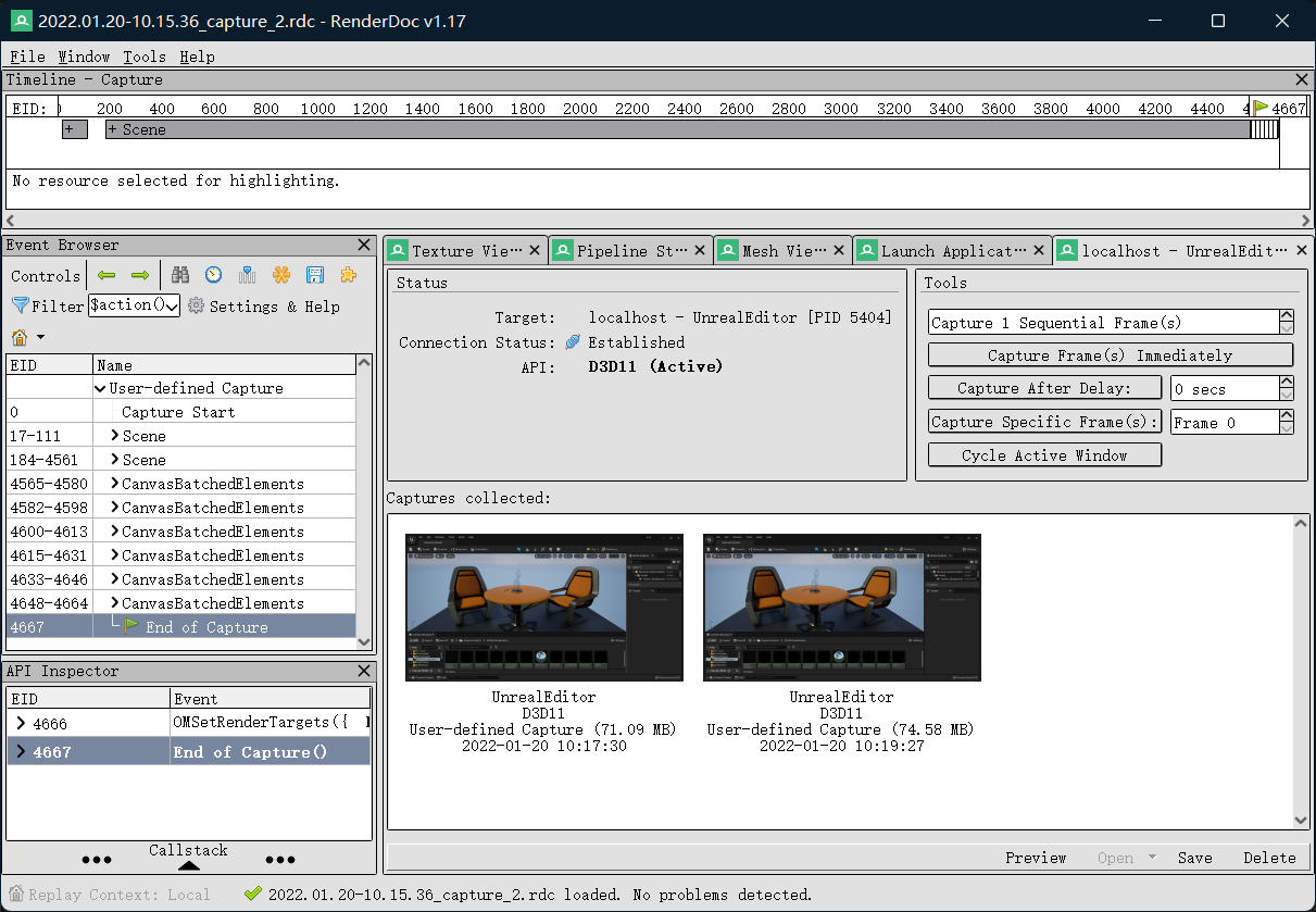 - 截取当前帧:调整相机位置,点击RenderDoc按钮,即可截取当前帧,查看渲染管线详情。