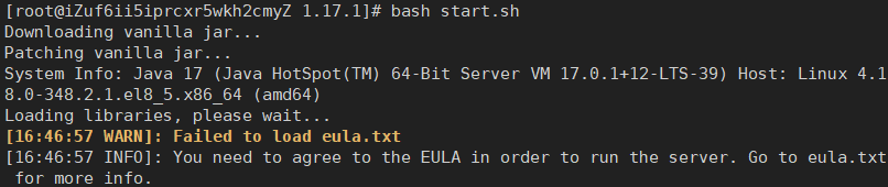 第一次运行服务器核心,会提示eula.txt文件加载失败,我们不用担心。